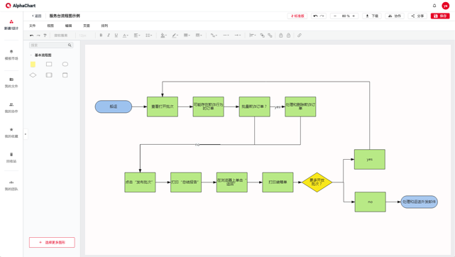 在AlphaChart中每個(gè)符號(hào)都是矢量的,可以填充顏色,改變大小,定義數(shù)據(jù)和連接。在流程圖標(biāo)準(zhǔn)符號(hào)包括4個(gè)基本流程符號(hào)橢圓形、矩形、箭頭、菱形和5類(lèi)中高級(jí)的流程圖符號(hào)。通用流程圖